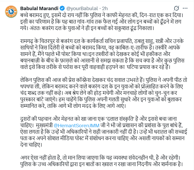 बाबुलाल मरांडी ने सोशल मीडिया प्लेटफॉर्म X पर लिखा कि बच्चों की बरामदगी में पुलिस ने मेहनत की, इसमें कोई संदेह नहीं है, लेकिन असली खोजबीन और अंतिम सफलता में बजरंग दल के कार्यकर्ताओं की भूमिका को नजरअंदाज़ किया गया। उन्होंने आरोप लगाया कि पुलिस अपनी पीठ खुद थपथपा रही है, जबकि जमीनी स्तर पर काम करने वालों का नाम तक नहीं लिया गया।