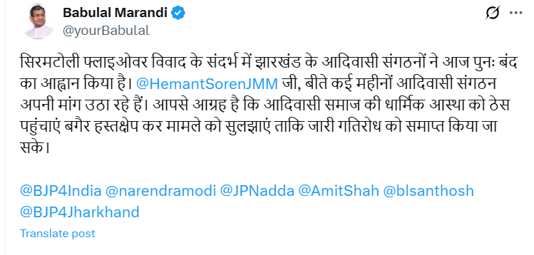 “सिरमटोली फ्लाईओवर विवाद के संदर्भ में झारखंड के आदिवासी संगठनों ने आज पुनः बंद का आह्वान किया है। मुख्यमंत्री हेमंत सोरेन, बीते कई महीनों से आदिवासी संगठन अपनी मांगें उठा रहे हैं। आपसे आग्रह है कि आदिवासी समाज की धार्मिक आस्था को ठेस पहुंचाए बिना हस्तक्षेप कर मामले को सुलझाएं ताकि जारी गतिरोध समाप्त हो सके।”