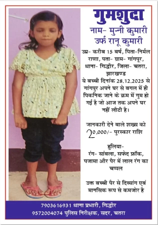 चतरा: झारखंड के चतरा जिले से एक 15 वर्षीय दिव्यांग किशोरी के लापता होने का मामला सामने आया है। गिद्धौर थाना क्षेत्र के गांगपुर गांव की रहने वाली मुन्नी कुमारी उर्फ रानू कुमारी 28 दिसंबर 2025 से रहस्यमयी हालात में घर से गायब है। किशोरी के पिता का नाम निर्मल राणा बताया गया है।
