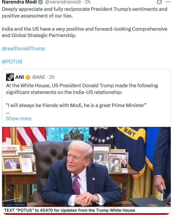पीएम मोदी ने लिखा, “भारत और अमेरिका के बीच रणनीतिक साझेदारी व्यापक, सकारात्मक और भविष्य की ओर देखने वाली है। मैं राष्ट्रपति डोनाल्ड ट्रंप की भावनाओं और हमारे रिश्तों के सकारात्मक आकलन की सराहना करता हूं। हमारे बीच यह संबंध लगातार मजबूत हो रहे हैं और मैं राष्ट्रपति ट्रंप का तहे दिल से धन्यवाद करता हूं।”