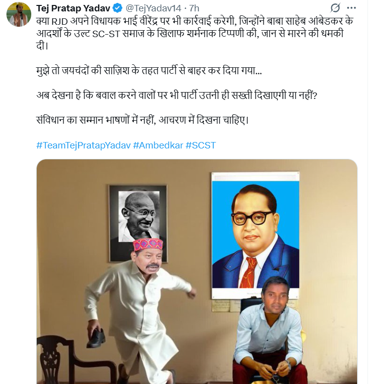तेज प्रताप ने एक एनिमेटेड फोटो के साथ लिखा कि जिस तरह से बाबा साहेब आंबेडकर के विचारों के खिलाफ जाकर एक दलित अधिकारी को अपशब्द और धमकी दी गई है, क्या उस पर भी पार्टी उतनी ही सख्ती दिखाएगी, जितनी मुझ पर दिखाई गई?